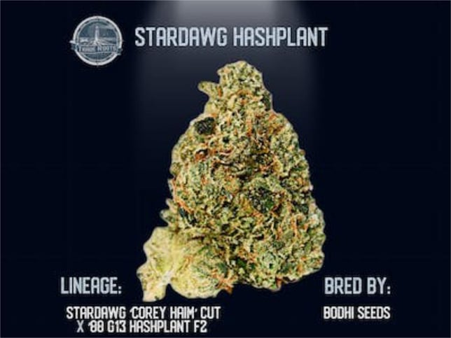 Stardawg Hashplant is a super frosty, loud, Indica Dominant hybrid (30% sativa/70% indica) strain that is a potent cross between Stardawg ‘Corey’ x the infamous "88 G13 Hashplant. G13, also known as “G-13” or “Government Indica Strain 1,”.