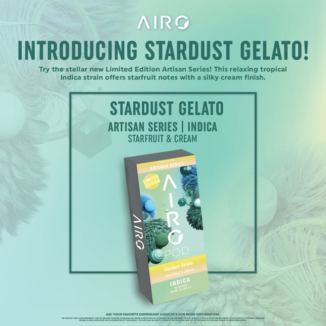 Immerse yourself in a blissful and tasteful stardust paradise with Airo Brands Artisan Series Stardust Gelato. Stardust Gelato is an Indica cartridge that brings a feeling of floating on heaps of fluffy clouds in the evening sky. As you inhale, taste sweet, mild, and tart tangy starfruit and cream gelato. As you exhale, inhale rich fruity scents and feel elated pleasure as you drift off into the celestial city of your mind.