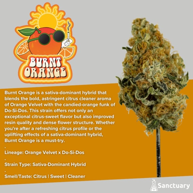 Burnt Orange is a sativa-dominant hybrid that blends the bold, astringent citrus cleaner aroma of Orange Velvet with the candied-orange funk of Do-Si-Dos. This strain offers not only an exceptional citrus-sweet flavor but also improved resin quality and dense flower structure. Whether you're after a refreshing citrus profile or the uplifting effects of a sativa-dominant hybrid, Burnt Orange is a must-try.