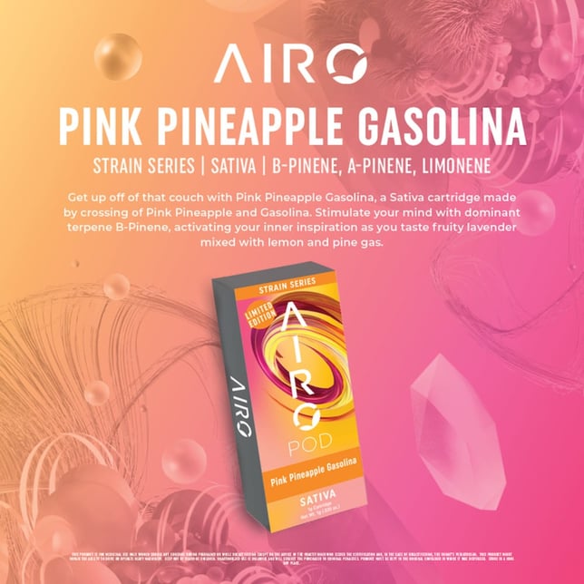 Get up off of that couch and get your creative juices flowing with Strain Series Pink Pineapple Gasolina by Airo Brands. Pink Pineapple Gasolina is a Sativa-dominant cross of Pink Pineapple and Gasolina. As you inhale, stimulate your mind with dominant terpene b-Pinene, activating your inner inspiration. Taste fruity lavender mixed with lemon and pine gas. When you exhale, feel the negativity rush out of you and refill with an uplifted sense of positive determination.