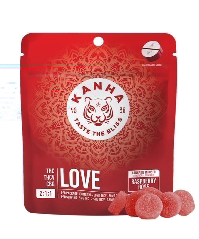 Experience deep euphoria, enhanced mood and amplified arousal in every bite. Our LOVE gummy combines the delicious flavors of Raspberry and Rose with a perfectly formulated 2:1:1 threesome of THC, CBG and THCV.
