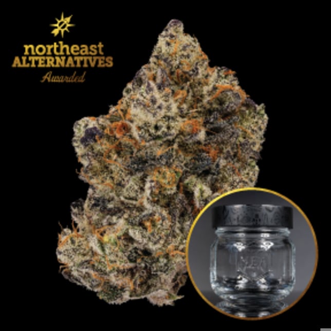The indica-leaning hybrid offspring of Meatloaf and Mendo Breath, Meat Breath is relaxing yet functional. Don’t be derailed by the name; it’s just a smoke shield—there’s no burgers here. Its sweet and doughy fragrance is gentle on the nostrils, while its flavor profile is much louder, splashed with zesty lemon, citrus, and pine. Meat Breath’s buds display dark purple hues with glimpses of pale green, all encased in trichomes akin to raw sugar granules. Bright orange pistils appear in small clusters like campfires. Fans of Meat Breath rejoice in its upbeat, mood-elevating onset. Many report the boost as brief, quickly diving into its indica gene pool that includes GDP. Such tranquility is best utilized for nighttime consumption.