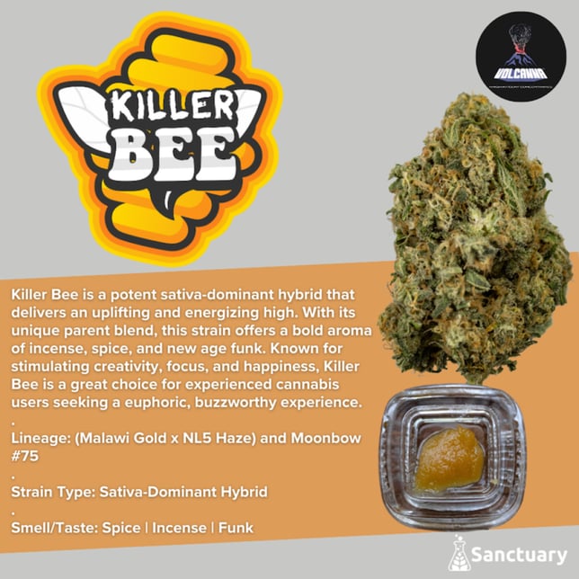Killer Bee is a potent sativa-dominant hybrid that delivers an uplifting and energizing high. With its unique parent blend, this strain offers a bold aroma of incense, spice, and new age funk. Known for stimulating creativity, focus, and happiness, Killer Bee is a great choice for experienced cannabis users seeking a euphoric, buzzworthy experience.