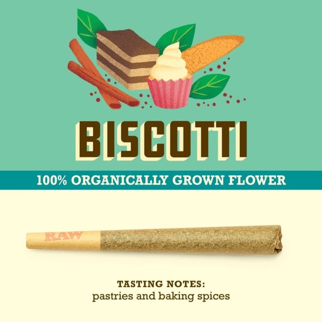 Biscotti is a potent indica-dominant hybrid strain reportedly made by crossing Gelato 25 with Sour Florida OG. Others report that Biscotti is Motorbreath x G41. This strain produces a cerebral high that leaves consumers feeling relaxed,creative, and buzzy from head-to-toe. The effects of Biscotti are known to creep up on consumers, so it's best to take it slow with this strain. In terms of flavor, Biscotti tastes like sweet cookies with undertones of diesel. With a THC level of 21%, medical marijuana patients turn to this strain to relieve symptoms associated with stress, anxiety, and depression. The striking trichome coverage of this strain gives it top shelf appeal. Biscotti was originally bred by Cookies Farms.