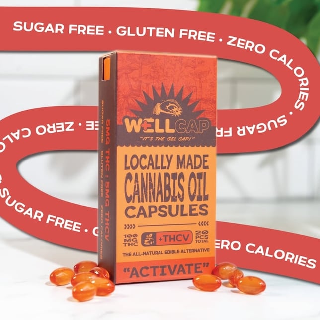 WELLCAP Activate gel caps are perfect for starting your day, or great before a workout. The addition of THCV helps to retain focus, increase energy, and overall uplift. This package contains 20 Activate gel capsules. 20pk/ 5mg THC:5mg THCV per piece All WELLCAP gel capsules are SUGAR-FREE, GLUTEN-FREE and ZERO CALORIES, making them a great alternative to traditional edibles. The blister packaging ensures precise and convenient on-the-go dosing. Do not chew. Visit wellcap.me for more information.