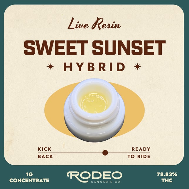 Rodeoās Sweet Sunset SP Concentrate is a vibrant hybrid crafted from Sun-Grown Sunset Runtz capturing the strainās full-spectrum character through fresh-frozen extraction. With a bold 11% total terpene profileāincluding 3.15% Caryophyllene, 1.91% Myrcene, and 1.42% Limoneneāthis concentrate offers a tropical-sweet aroma and a balanced high that eases the body while sparking the mind. Smooth, flavorful, and terp-rich, Sweet Sunset is your ticket to golden hour bliss any time of day.