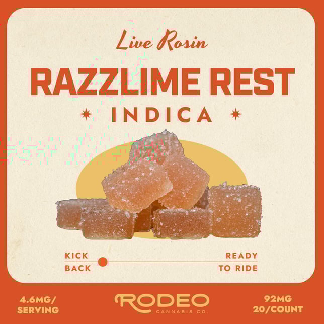 Rodeo Live Rosin RazzLime Rest Gummies. Crafted with precision, each gummy delivers 4.61% THC and 4.58% CBN—two of cannabis’s most potent, complementary compounds. Sourced from live resin derived from freshly harvested plants, Rodeo locks in the full plant profile so you get maximum flavor and therapeutic benefit in every bite.