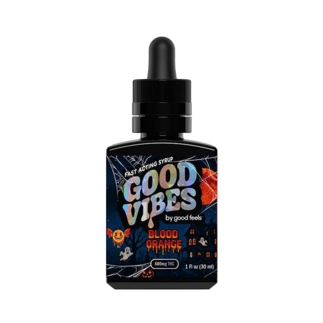 Taste Halloween magic in a bottle with Good Vibes Spooky Blood Orange. This limited edition syrup captures the rich, tangy flavor of blood orange with its signature deep citrus notes and subtle berry undertones, plus an eerie glow under black light that's UV reactive for Halloween fun. With 500 milligrams of THC in a 1 ounce bottle, every serving is fast acting, sugar free and calorie free. Perfect for haunted house parties and spooky seasonal mocktails.