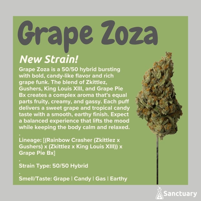 Grape Zoza is a 50/50 hybrid bursting with bold, candy-like flavor and rich grape funk. The blend of ZKZ, Gushers, King Louis XIII, and Grape Pie Bx creates a complex aroma thatโs equal parts fruity, creamy, and gassy. Each puff delivers a sweet grape and tropical candy taste with a smooth, earthy finish. Expect a balanced experience that lifts the mood while keeping the body calm and relaxed.