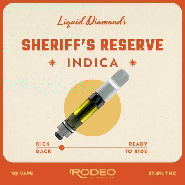 Rodeo’s Sheriff’s Reserve is a premium Liquid Diamonds Indica vape crafted for those who want unmatched potency and a deeply relaxing experience. With an impressive 87.6% THC, this 1G Cartridge delivers smooth, crystal-clear vapor and the full-bodied flavor of pure cannabis diamonds. Expect a calming, body-heavy high perfect for unwinding after a long day, easing stress, and settling into restorative rest. Refined, powerful, and true to its name, Sheriff’s Reserve is a top-shelf choice for Indica lovers who want the strongest ride in town.