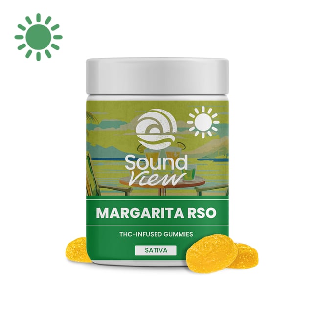 Savor the refreshing taste of a classic margarita with SoundView's Margarita RSO Infused Gummies. Each bite offers zesty lime, a touch of sweetness, and a hint of salt, delivering the true margarita flavor with a unique buzz. Infused with Rick Simpson Oil (RSO), these gummies provide a robust and holistic effect. Perfect for unwinding or elevating social gatherings, enjoy the delicious taste and potent, long-lasting experience all in one gummy. Warning: Contains Tree Nuts (MCT Oil).