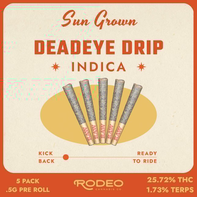 Rodeo Sun Grown Deadeye Drip Indica 0.5g 5-Pack Prerolls deliver a bold, deeply relaxing experience in a convenient, ready-to-enjoy format. Crafted from premium sun-grown flower, Deadeye Drip offers rich, earthy flavor with subtle sweet and gassy undertones that create a smooth, satisfying smoke. With a potent 25.72% THC, this indica provides strong, body-focused effects that help ease tension and promote calm, while 1.73% total terpenes enhance aroma and flavor for a well-rounded experience. Each pack includes five 0.5g prerolls, expertly rolled for an even, consistent burn every time. Perfect for evening sessions or winding down at the end of the day, this 5-pack is ideal for indica lovers seeking elevated potency, full flavor, and convenient portioned prerolls without compromising quality.