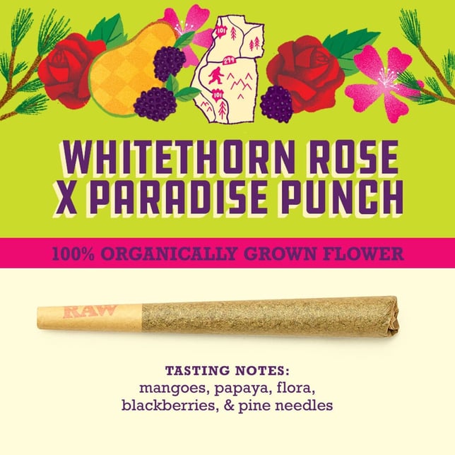 Whitethorn Rose is a cultivar created by legendary breeders and cultivators, Huckleberry Hill. It is a cross of Paradise Punch x Lemon OG - Paradise Punch is (Blueberry OG x Lavender OG). The cross between these amazing strains (Whitethorn Rose x Paradise Punch), grows with bright magenta pistils and has a dramatic purple color when it finishes. It has a bright fruity smell that layers over lavender and cream with notes of freshly turned earth underneath. The Whitethorn Rose strain can taste sweet, fruity, citrus, berry, and hashy. The Whitethorn Rose x Paradise Punch has a sativa-hybrid effect- uplifting with a blanket of well-being. The strain has won an Emerald Cup in the ice water hash category, and second place in the rosin category.