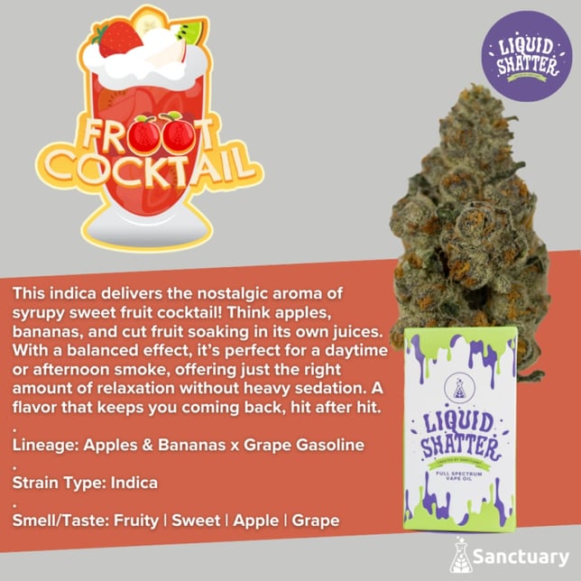This indica delivers the nostalgic aroma of syrupy sweet fruit cocktail! Think apples, bananas, and cut fruit soaking in its own juices. With a balanced effect, it's perfect for a daytime
