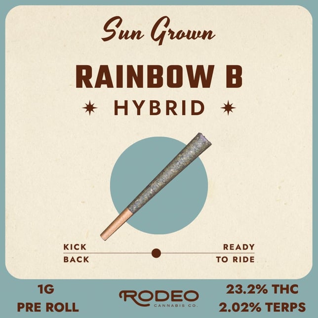 Rodeo Sun Grown Rainbow B. Hybrid 0.5g Preroll 2pk is made with sun grown cannabis selected for its vibrant flavor and terpene-rich profile. This hybrid preroll delivers smooth, aromatic smoke with bright, fruity notes balanced by light earthy undertones. Grown under natural sunlight and high in terpenes, Rainbow B. offers a balanced and flavorful option for any time of day. This 0.5g preroll provides an easy, ready-to-enjoy way to experience full-spectrum flower with true strain character.