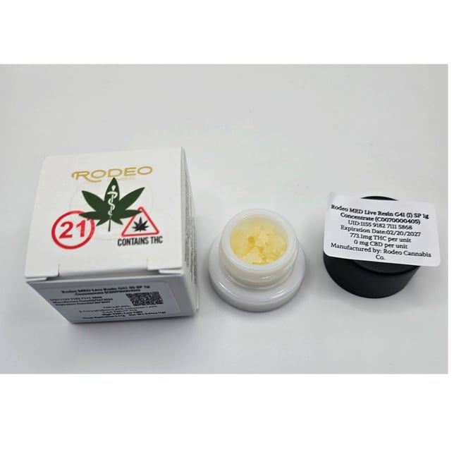 Rodeo MED Live Resin G41 Indica SP 1g Concentrate is extracted from fresh, sun grown flower to preserve the plant’s natural terpene profile and strain-specific character. Using live resin extraction, this concentrate captures the full flavor and aroma of G41 for a smooth, true-to-flower experience. G41 offers rich, earthy notes with subtle sweetness and spice, delivering a bold yet balanced profile. This indica-leaning concentrate is ideal for those who appreciate full-spectrum flavor and consistent quality in every dab. Made from sun grown flower and carefully processed, this 1g live resin concentrate provides a flavorful and refined option for concentrate enthusiasts.