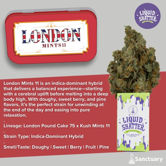 London Mints 11 is an indica-dominant hybrid that delivers a balanced experience-starting with a cerebral uplift before melting into a deep body high. With doughy, sweet berry, and pine flavors, it's the perfect strain for unwinding at the end of the day and easing into pure relaxation.